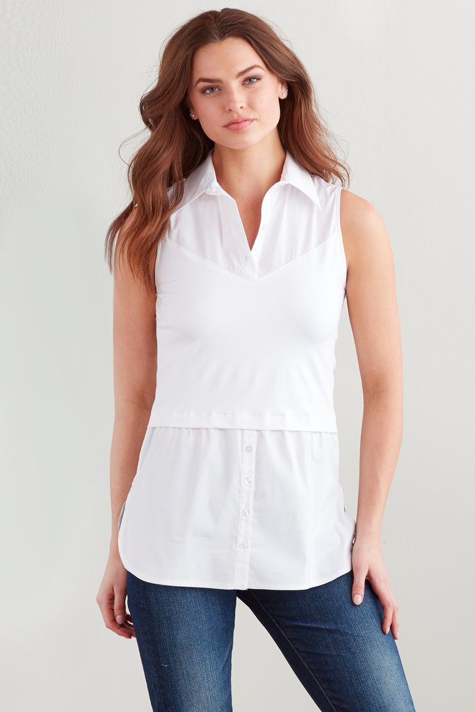 - Our layering tank is made to be worn UNDER pullovers and cardigans. This women's white sleeveless button down blouse gives you the look of a full shirt without the bulk.