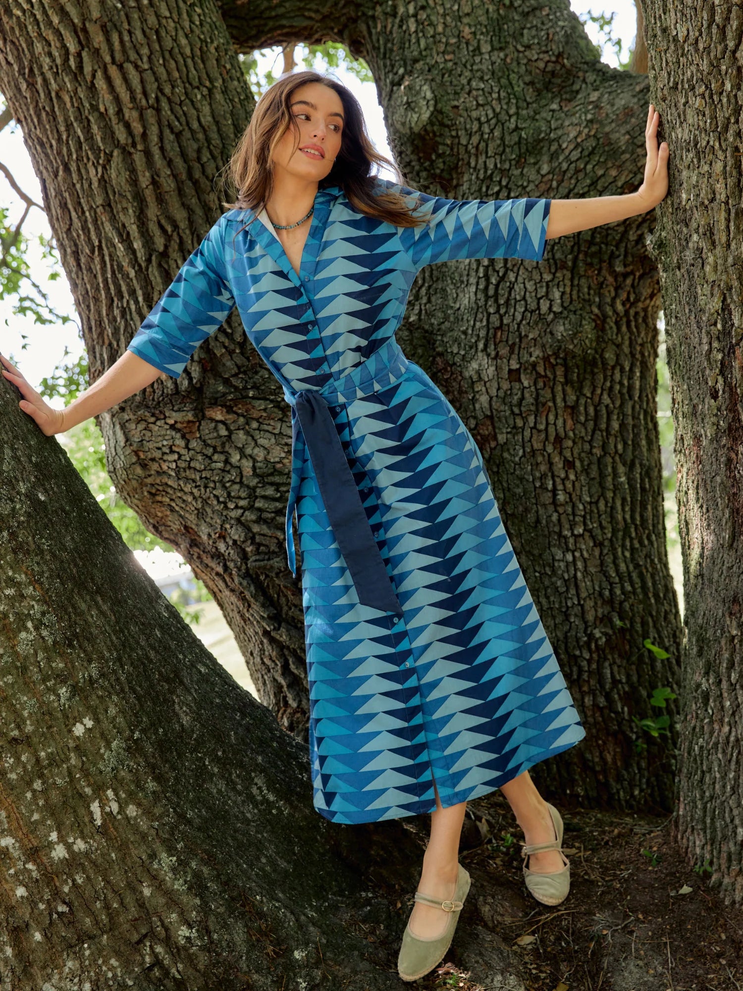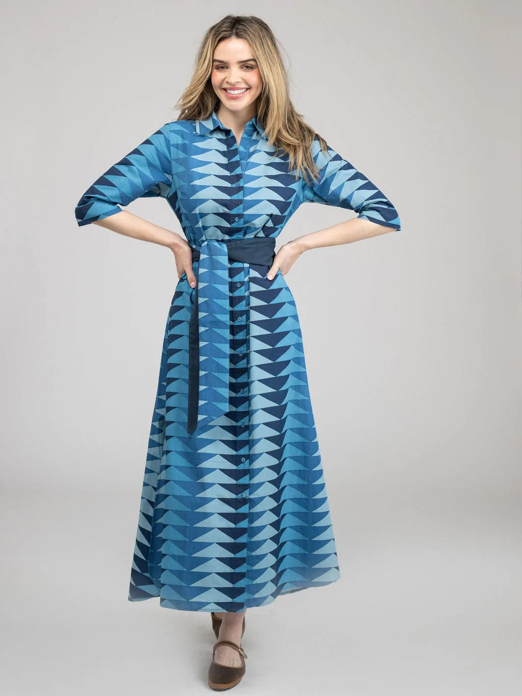 Effortlessly elevate your style with The Eloise Dress. The classic design includes a button up bodice, quarter length sleeves, and an optional tie waist for a timeless silhouette. Featured in our new Fall Blue Bagru Triangle print. Perfect for everyday wear.