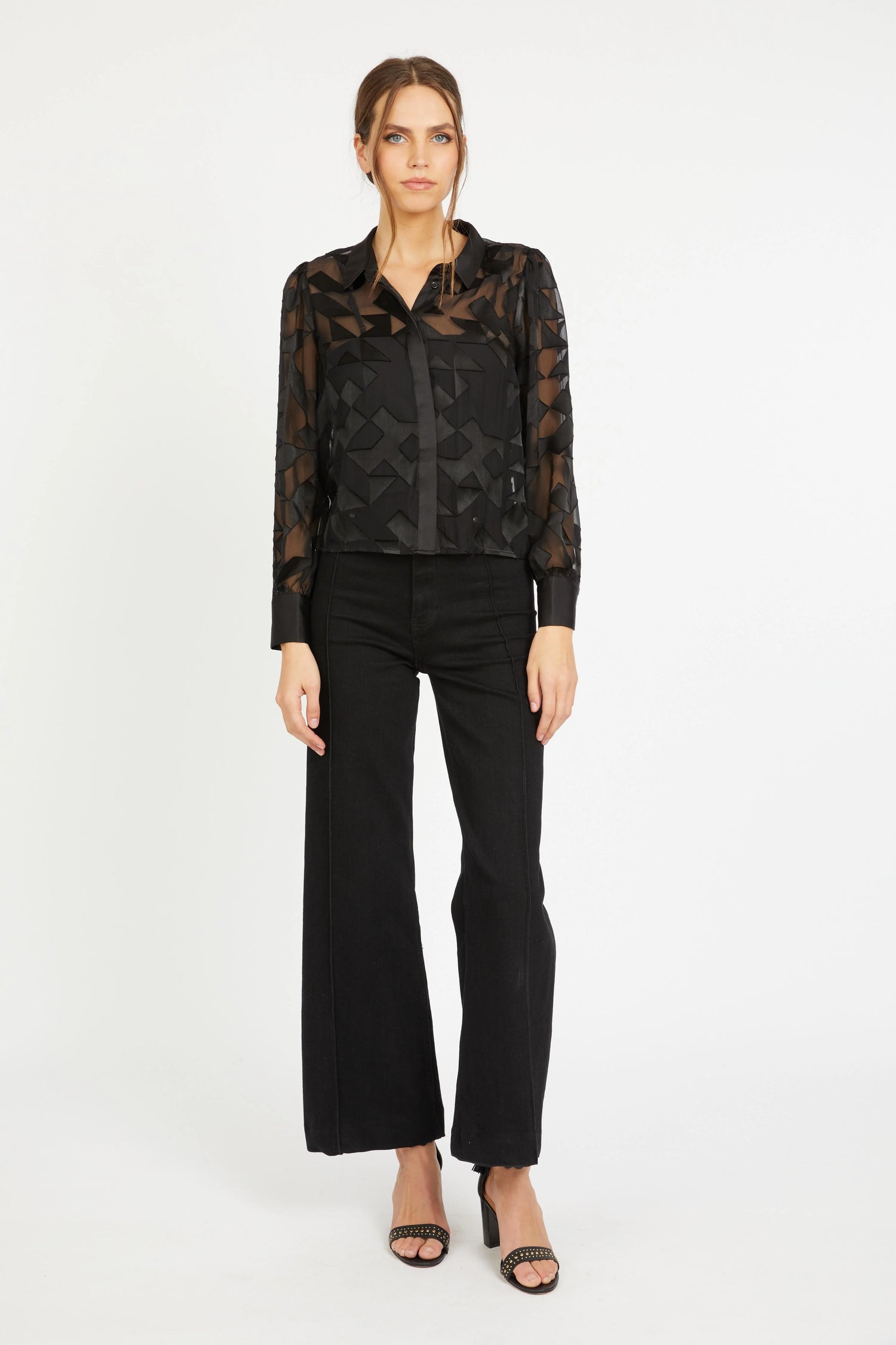 The Emmie Top is reimagined in luxurious black viscose silk with a striking geometric burnout design. This modern update blends subtle sheen and sheer elements for a fresh, sophisticated look. Featuring a button-down front, collar, full-length sleeves, and a straight hem, it retains its elegant charm.