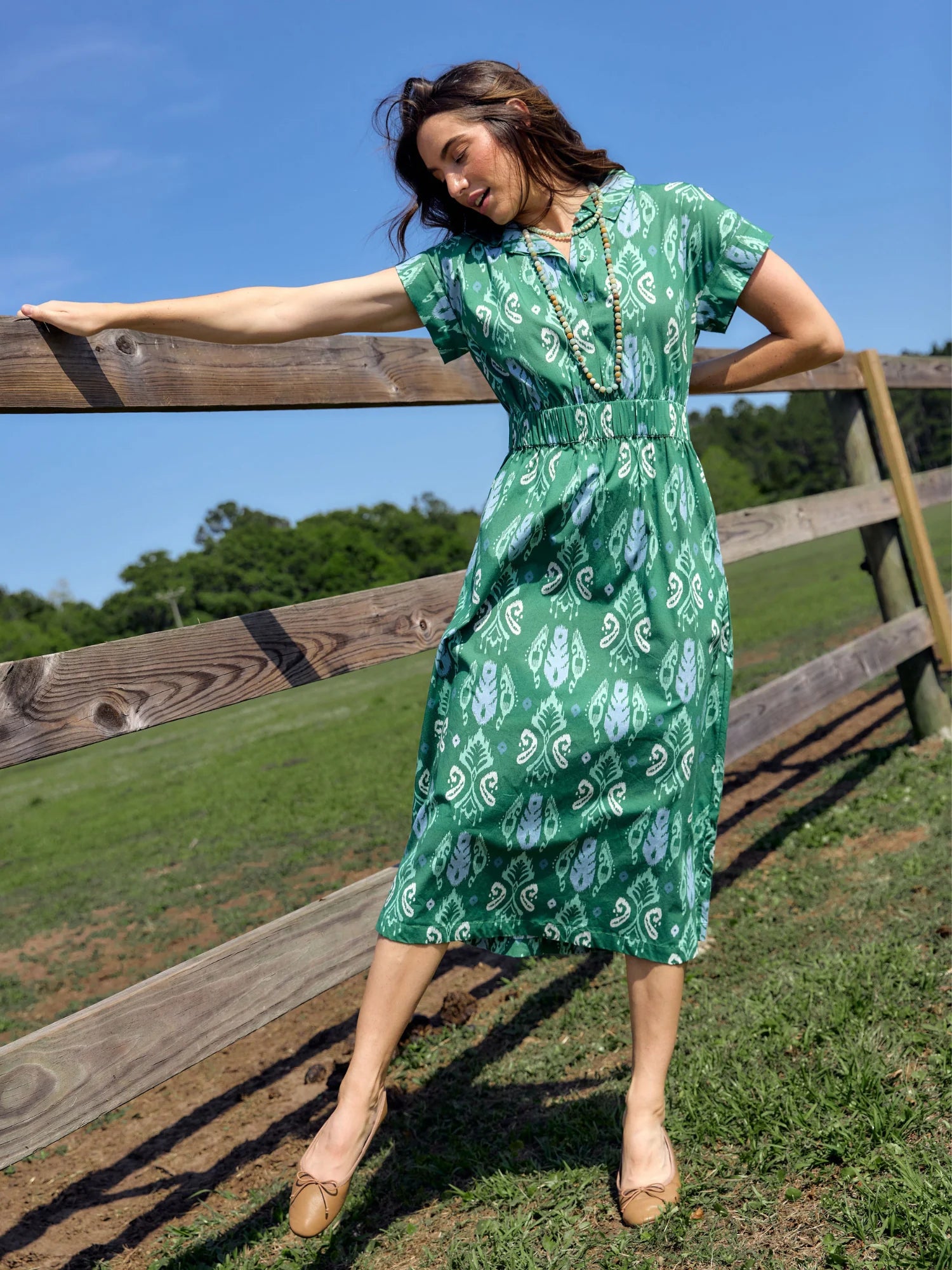 Discover the exquisite Lisa Dress, featuring a stunning Green Ikat Stripe. This midi dress boasts a crisp, shirt-like collar and flattering sleeves, while its elastic waistband ensures both style and comfort for all-day wear.