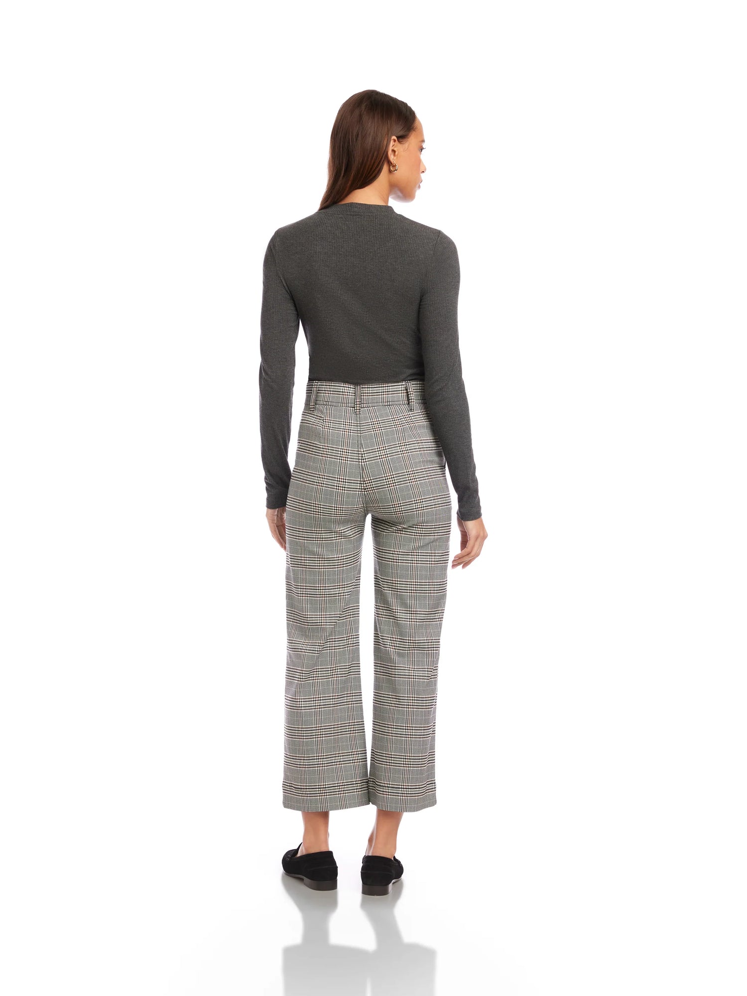 Crafted from stretch plaid woven fabric, they feature a high-rise waist with belt loops, a button-zipper closure, and a wide-leg silhouette that crops just above the ankle. Finished with functional front pockets, they blend polish and comfort effortlessly—ideal for work or weekend.