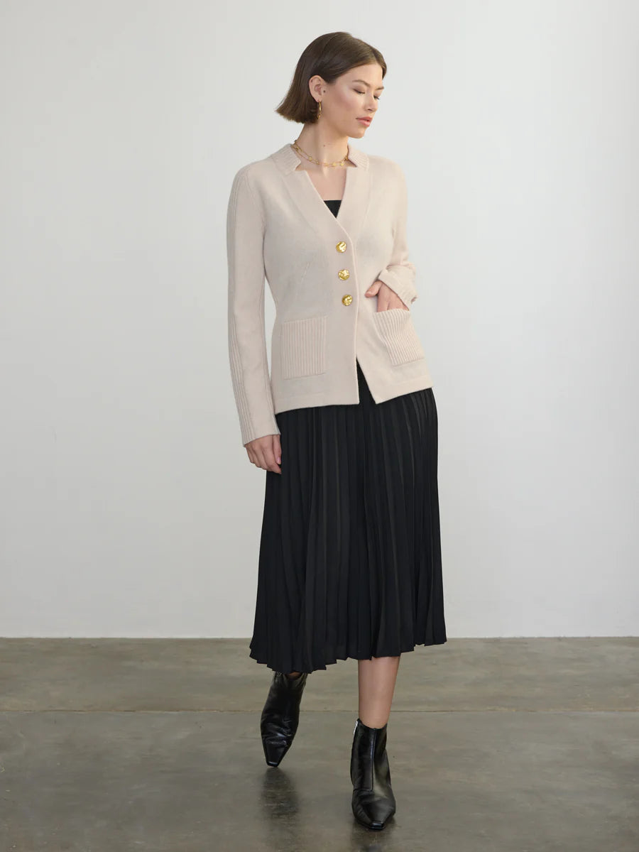 Tailored cocktail jacket with zero compromise on comfort. Crafted from softest premium cashmere, St. Amelia features a refined notch collar, patch pockets and statement silver or gold tone buttons for an understated classy silhouette with a touch of boldness. The perfect piece to update your everyday blazer or throw on to instantly elevate any outfit.